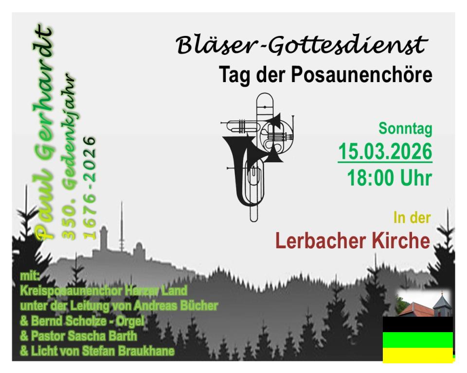 Am Sonntag, den 15.03.2026 lädt der Kreisposaunenchor Harzer Land unter der Leitung von Andreas Buecher zusammen mit Organist Bernd Scholze sowie Pastor Sascha Barth ab 18:00Uhr zu einem besonderen Gottesdienst unter dem Motto "Paul Gerhardt" in die Lerbacher Kirche ein.