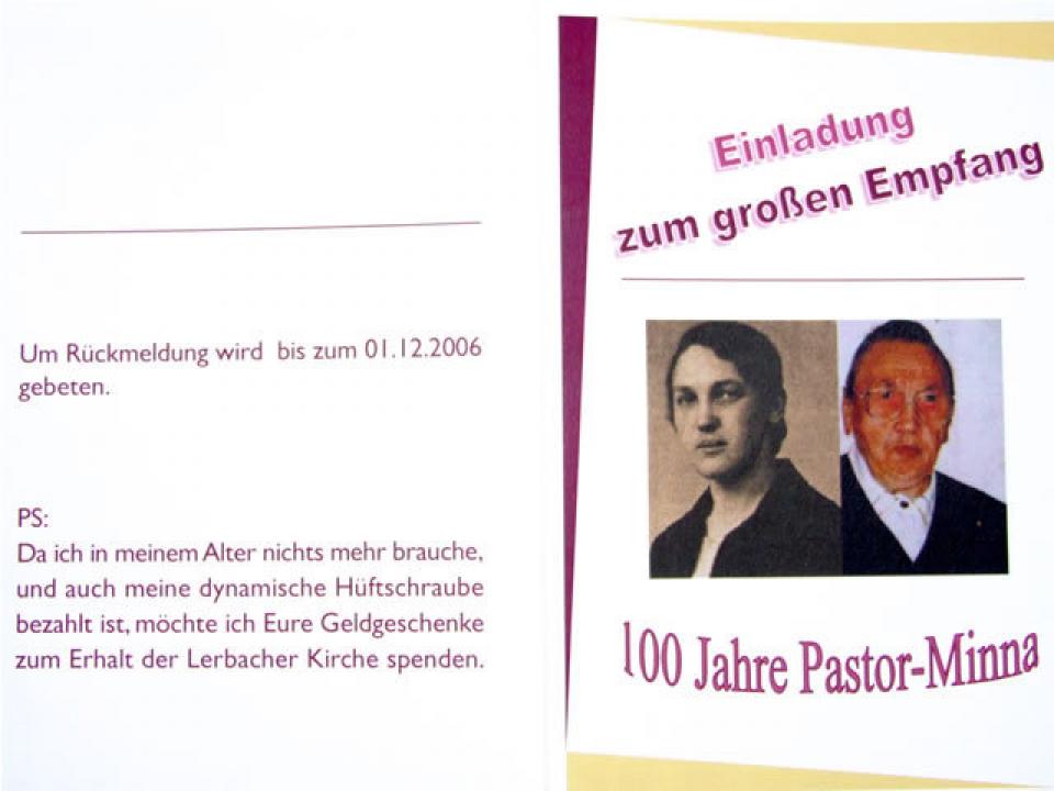 Geschenke zum 100. Geburtstag von Minna Schönfelder''Da ich in meinem Alter nichts mehr brauche, und auch meine dynamische H?ftschraube bezahlt ist, m?chte ich Eure Geldgeschenke zum Erhalt der Lerbacher Kirche spenden'' schrieb Minna Sch?nfelder auf die Einladungskarte zum Empfang anl??lich ihres 100. Geburtstags im Dezember.