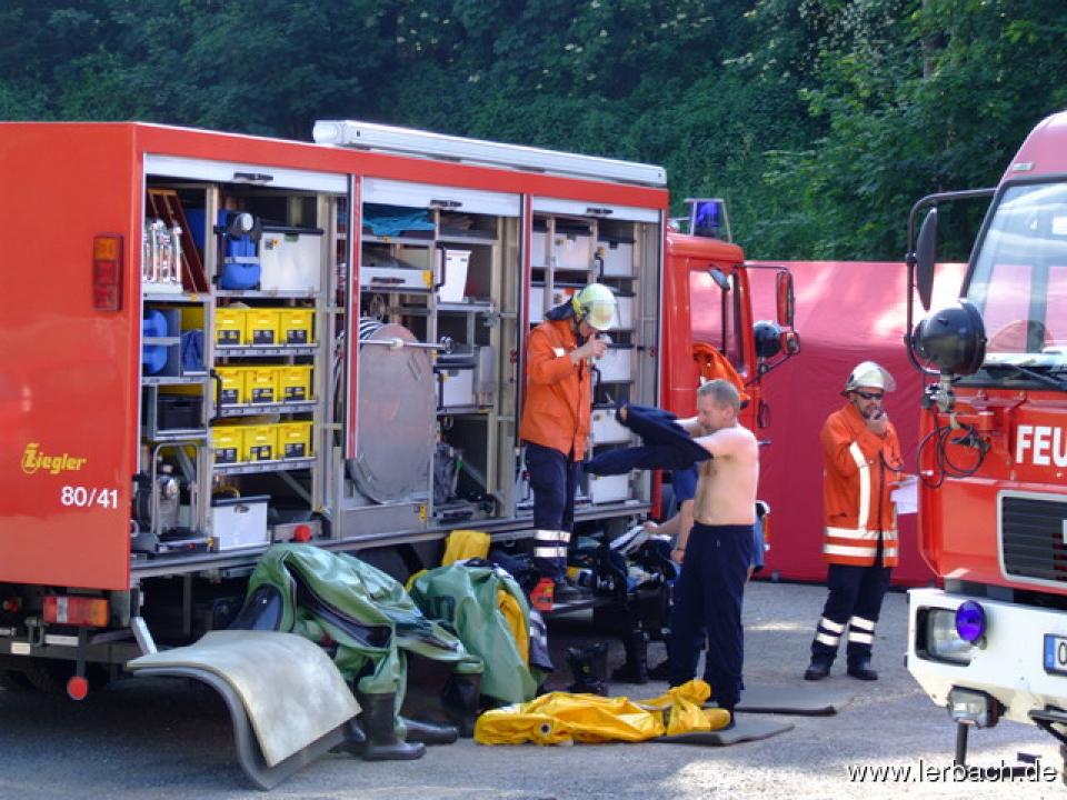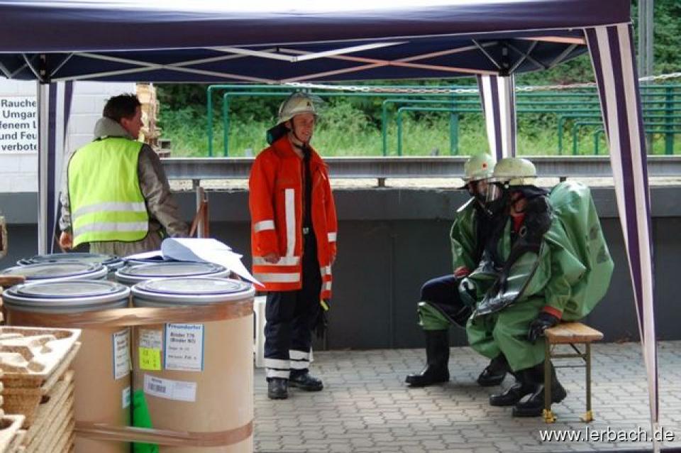 Gleichzeitig gab es einen angenommenen Unfall bei Fa. Zuelch, zu dem der Gefahrgutzug ausrücken musste, da in der Firma viele Chemikalien zur Farbherstellung lagern.