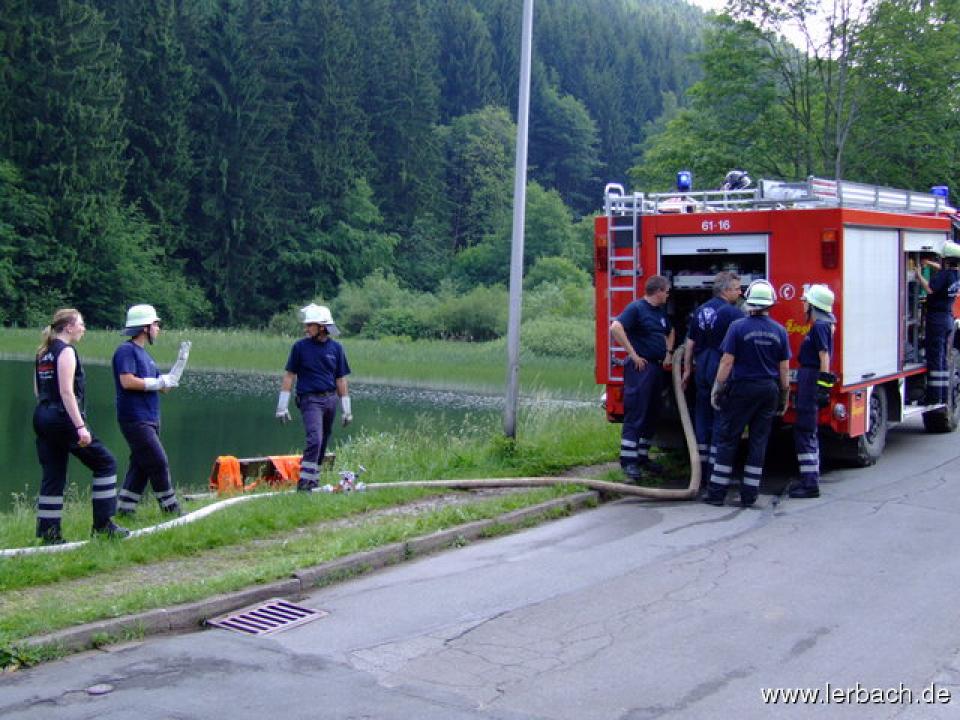 Das dritte angenommene Schadensereignis war dann noch ein Waldbrand oberhalb des Mühlenteichs, wo die Löschwasserversorgung die größte logistische Aufgabe war. Hierzu rückten Wehren aus allen Ecken des Landkreises an, um mit Tanklöschfahrzeugen Wasser aus dem Mühlenteich zur Brandstelle an der roten Sohle zu bringen.
