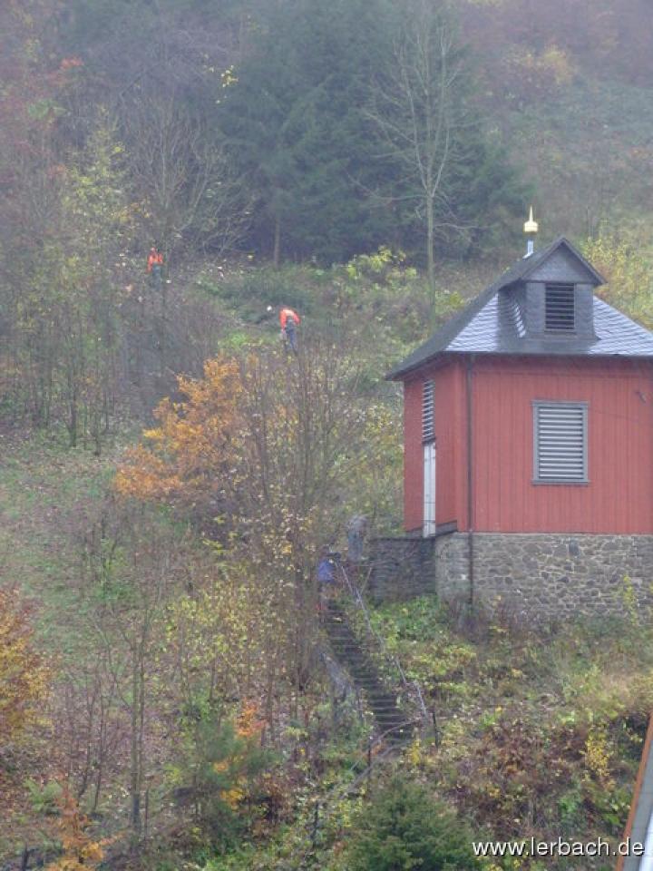 Zugang und BaumfällarbeitenBei gefühlten 120% Luftfeuchtigkeit hat heute morgen ein Arbeitskommando von 5 Mann den völlig zugewachsenen Lerbacher Glockenturm in Angriff genommen.