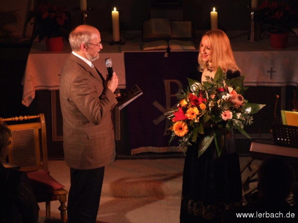 Zum Schluss des offiziellen Teils nutzte Astrid Harzbeckers größter anwesender Fan Dietmar Alberti die Gelegenheit, sich mit einem Blumenstrauß zu bedanken, dem sich Marianne Koch vom Lerbacher Kirchenvorstand anschloss. Danach gab es noch mehrere Zugaben und mit "Guten Abend, gut Nacht" schloss das Konzert.