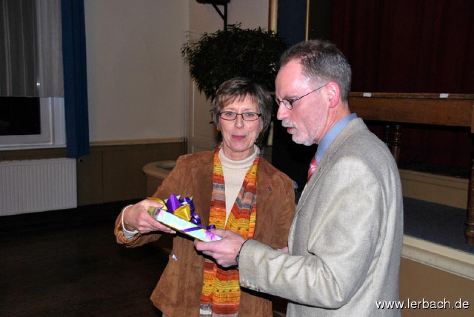Auch der erste Vorsitzende Eckhard Schmidt wurde geehrt: ohne sein Wissen hatte der restliche Vorstand eine Ehrung für 15-jährige Vorstandsarbeit (zunächst 3 Jahre als 2. Vorsitzender und seit 12 Jahren als erster Vorsitzender) vorbereitet. Die zweite Vorsitzende Claudia Szemeitat hob in ihrer Laudatio die bescheidene Art hervor, mit der Eckhard Schmidt sein Amt wahrnimmt. Besonders freute es sie, dass er es niemals versäumt, auch dem kleinsten Rädchen in der Vereinsmaschinerie seinen Dank zu sagen. Daher sei es an der Zeit gewesen, jetzt auch ihm einmal zu danken. Das griff spontan auch Ortsbürgermeister Frank Koch auf, der ebenfalls Eckhard Schmidts bescheidene und unermüdliche Arbeit für den überaus aktiven Verein lobte. Dies wurde von den Anwesenden im Saal mit einem langen, intensiven Applaus unterstrichen.