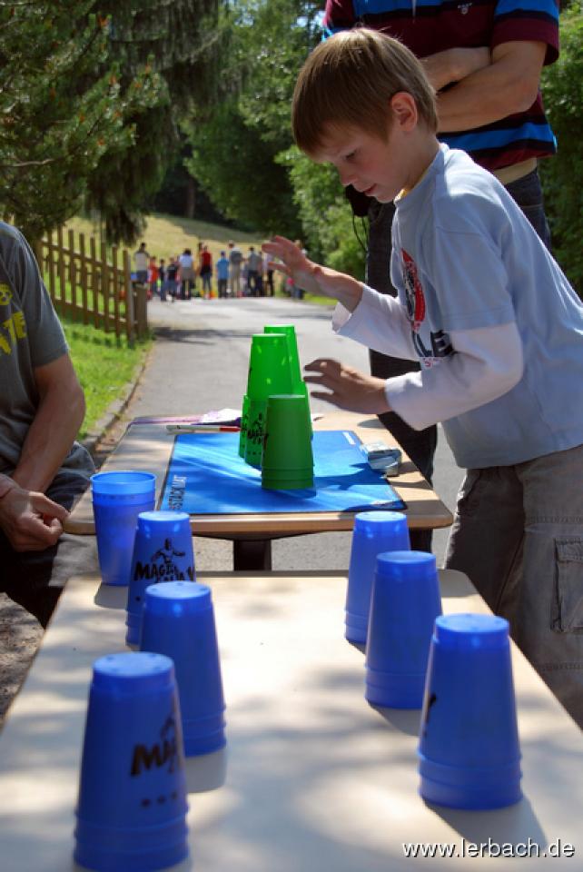Jedes Kind (und auch manche Eltern :-) ) bekam eine Karte, auf der es für jedes Spiel einen Stempel zu ergattern galt. Manche Aufgabe wie der Dosenlauf konnte nur gemeinsam mit den Eltern gelöst werden. Insgesamt hatten die Kinder aber immer klar die Nase vorn, die Eltern waren häufig chancenlos gegen ihre Sprösslinge.