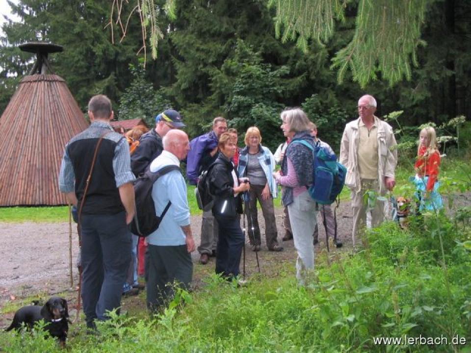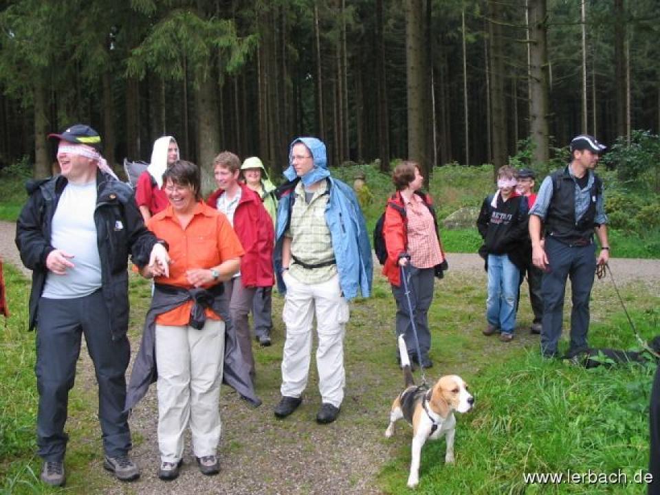Der leichte, vorübergehende Nieselregen war eine Wohltat und verdampfte sofort auf der Haut. Nur der „Drei Wetter Taft“ hielt nicht ganz, was er versprach, doch zum Glück war ja kein Spiegel in der Nähe. Und wer es mal blind versuchen wollte seinen Weg zu finden, konnte sich unterwegs auch die Augen verbinden lassen. Begleitet wurde die Gruppe, der 10-ca. 50 Jährigen von Manni Stricker, der an vereinbarten Plätzen mit seinem Versorgungsbus wartete und so manchem einen guten Rat in punkto Schuhwerk und Stockeinsatz mit auf den Weg geben konnte. Nach 28 Kilometern, einer sehr interessanten Strecke entlang des Oberharzer Wasserregals, leicht zu verspürendem Muskelkater in den Oberschenkeln und einem gierigen Verlangen nach frisch gebrühtem Kaffee erreichte der Trupp ohne Verluste und mit guter Laune das Kamp des Nieders. Forstamtes Clausthal. Nach kurzer Verschnaufpause wurden die Zelte aufgeschlagen, das Lagerfeuer errichtet und die Stöcke für Würstchen und Stockbrot selbst geschnitzt. Gitarrenklänge von Mika Koch ließen den schönen Abend ausklingen und die Wanderer müde in die Schlafsäcke fallen.