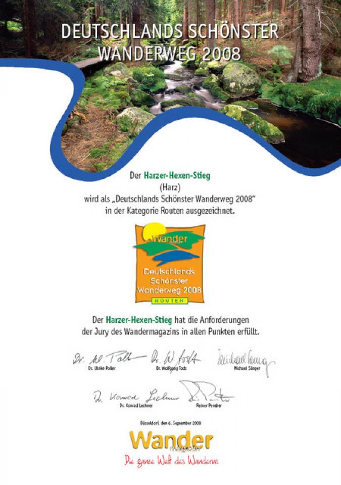 Anfang September wurde der Harzer-Hexen-Stieg von einer Jury des Wandermagazins, der führenden Deutschen Wanderzeitschrift, nun zu „Deutschlands schönstem Wanderweg 2008“ gewählt. Die Auszeichnung fand auf der Outdoor- und Trekkingmesse TourNatur in Düsseldorf statt, auf der der Harzer Verkehrsverband unter anderem auch den Harzer-Hexen-Stieg präsentierte.
