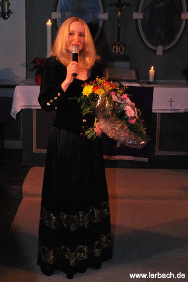 Im letzten Jahr überraschte Astrid Harzbecker das Publikum mit einer spontanen Darbietung der Puccini-Arie 'O mio bambino caro'. Extra für Lerbach sang sie diese Arie nun wieder und ließ im Gespräch nach dem Konzert wissen, dass sie großen Spaß an diesen klassischen Stücken hat und sich in diese Richtung auch gern weiterentwicklen würde. Zum Schluss des offiziellen Teils nutzte Astrid Harzbeckers größter anwesender Fan Dietmar Alberti die Gelegenheit, sich mit einem Blumenstrauß zu bedanken, dem sich Marianne Koch vom Lerbacher Kirchenvorstand anschloss. Danach gab es noch mehrere Zugaben und mit "Guten Abend, gut Nacht" schloss das Konzert.