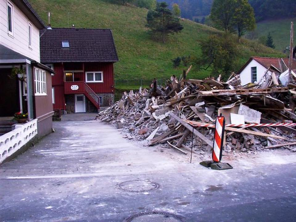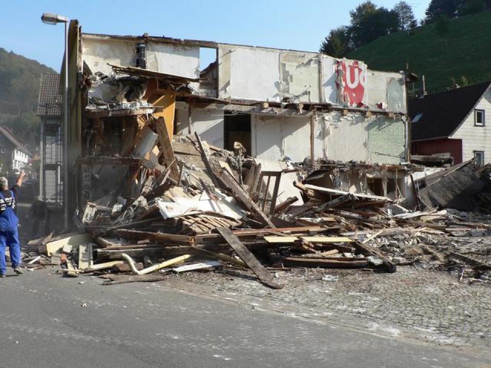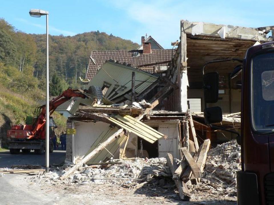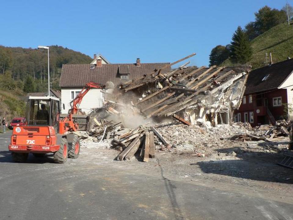Ungewohnt weite Aussicht für NachbarhäuserWer in den letzten Wochen durch den Ort gefahren ist, hat es bereits gesehen: das ehemalige Hotel "Glück Auf" wurde entkernt und für den Abriss vorbereitet. Am Samstag war es dann soweit: ein Bagger riß Wand um Wand ein, am Ende blieb nur noch ein Schutthaufen von dem über 300 Jahre alten Gebäude übrig.