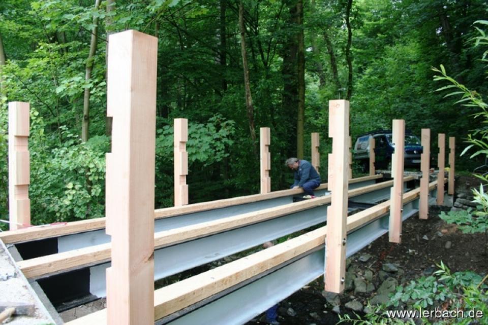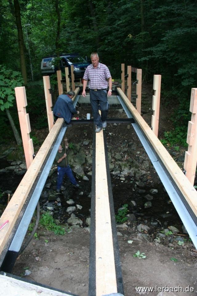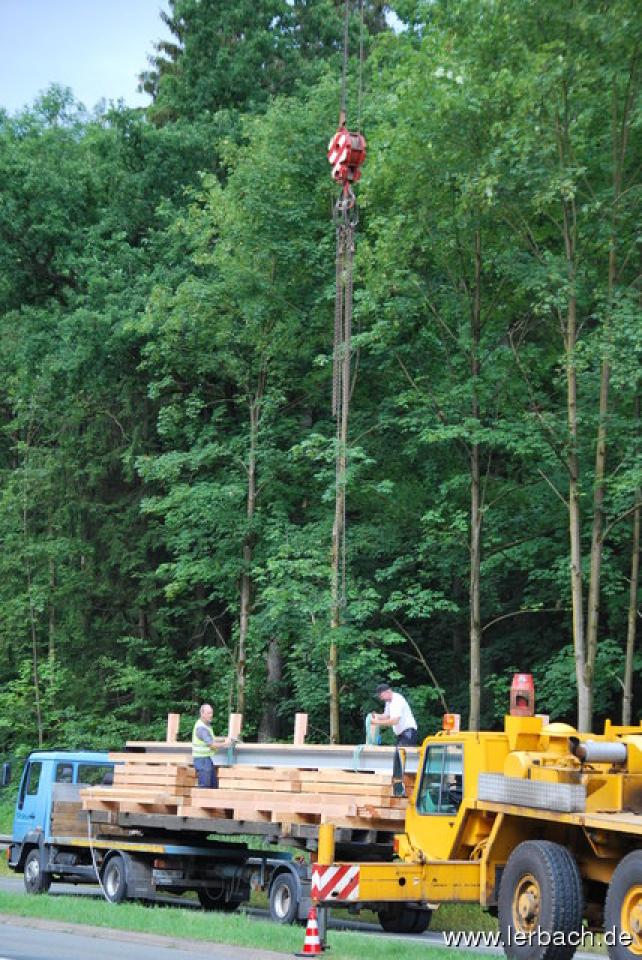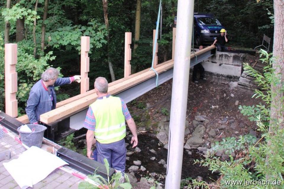Einbau mit KranwagenWer heute vormittag die untere Einfahrt nach Lerbach passieren musste, konnte den großen Kran nicht übersehen, der die Teile für die neue Brücke über den Lerbach hinunter zum Philosophenweg gehoben hat.