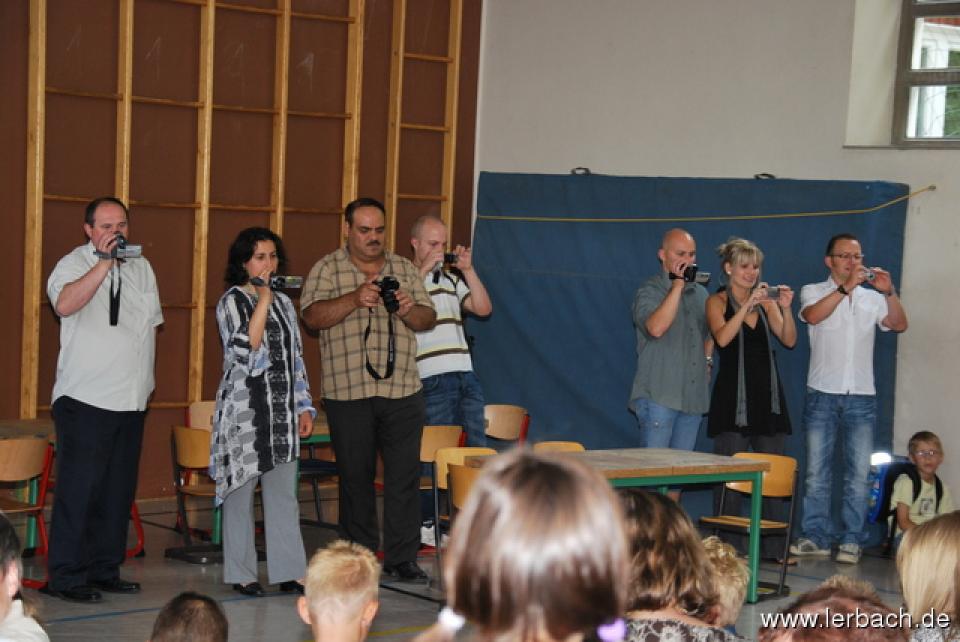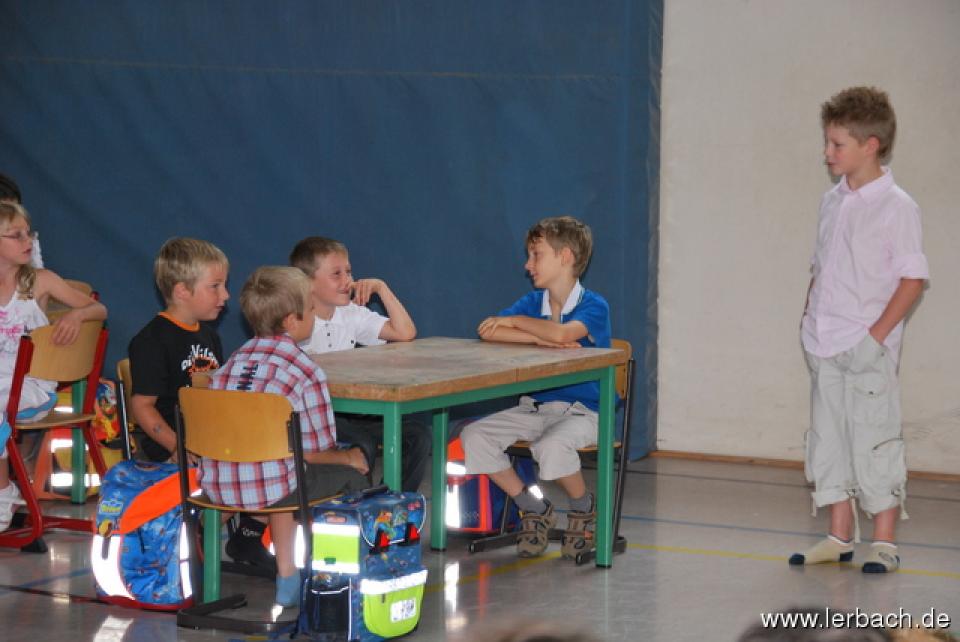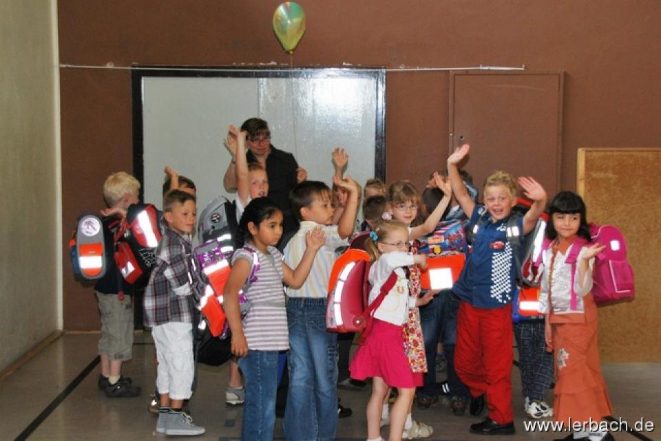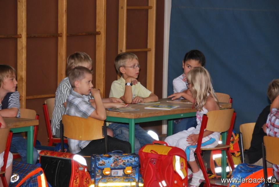 Zuerst besuchten die Erstklässler zusammen mit ihren Eltern den Einschulungsgottesdienst in der Lerbacher Kirche. Danach zog ein großer Treck hinauf zur Grundschule, wo die neuen Schüler zunächst von ihrer Schulleiterin Frau Höchstädter und dann von ihren Mitschülern der Kombiklasse 2/3 mit einem kleinen Theaterstück begrüßt wurden.