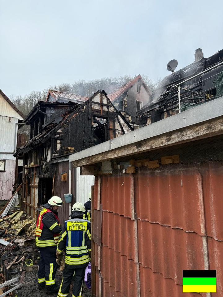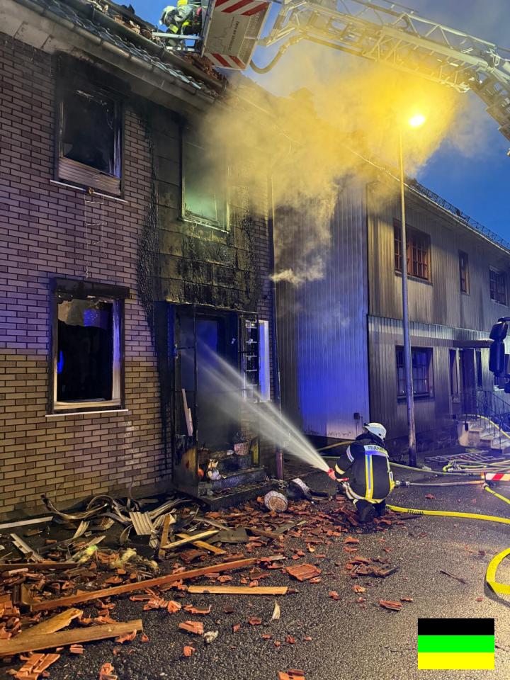 Feuer zerstört Wohnhaus und beschädigt Nachbargebäude, Ortsdurchfahrt für die Lösch- und Aufräumarbeiten gesperrt, Spenden für fünf Betroffene werden gesammelt
