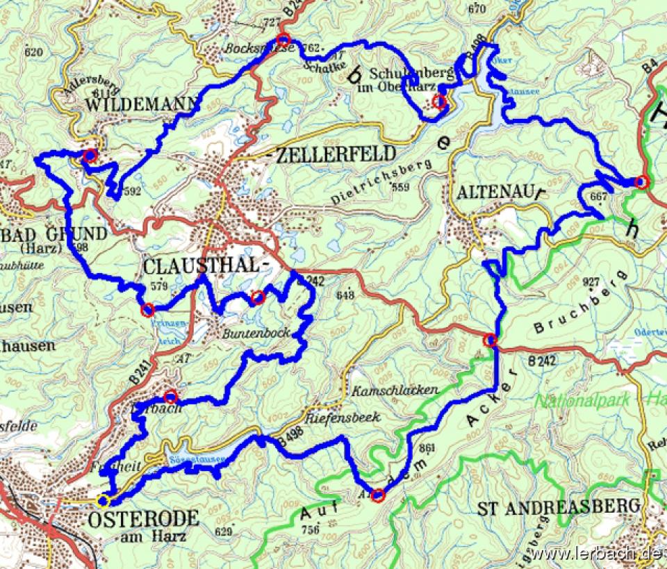 Start und Ziel ist der Campingplatz Eulenburg. Von dort geht es zum ersten Checkpoint an der Hanskühnenburg. Weiter geht es Richtung Altenau mit zwei weiteren Checkpoints am Grabenhaus Rose und der Wiese am Lichtenborn. Letztlich an Altenau vorbei geht es nach Schulenberg zum vierten Checkpoint. Von dort geht es über die Schalke zum Campingplatz Kreuzeck (Checkpoint 5) und weiter nach Wildemann zum sechsten Checkpoint. Der siebte Checkpoint ist der Campingplatz Obere Innerste. Weiter geht es zum Campingplatz Prahljust, wo der achte Checkpoint stehen wird. Der neunte und letzte Checkpoint vor dem Ziel ist dann der Marienblick am oberen Ende des Lerbacher Skihangs.