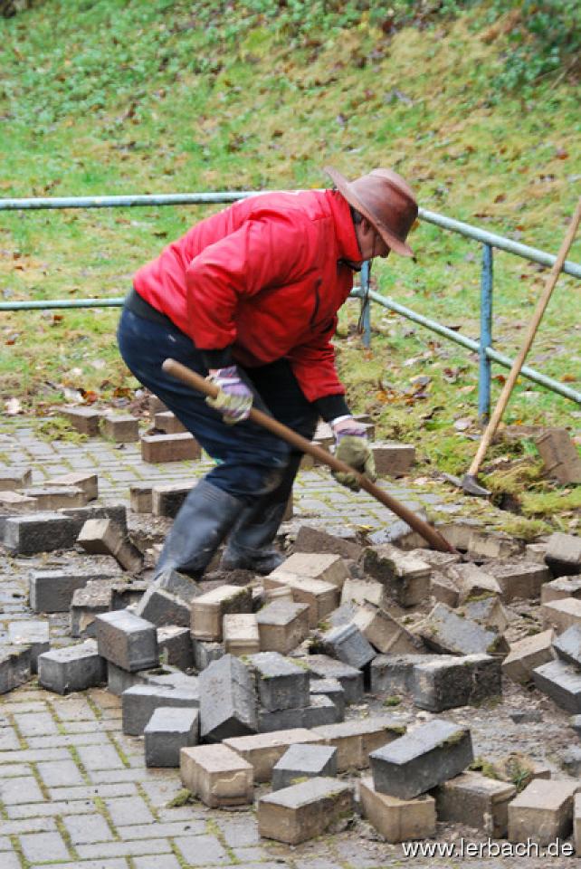 Der Förderverein Naturerlebnispark hat begonnen, das Pflaster auf dem Schwimmbadgelände aufzunehmen und für eine weitere Verwendung auf Paletten zu stapeln. Dies ist eine Vorarbeitung für den geplanten Abriss des Kassenhäuschens.