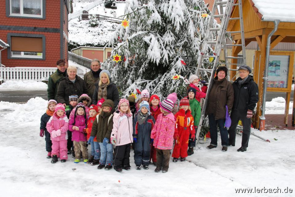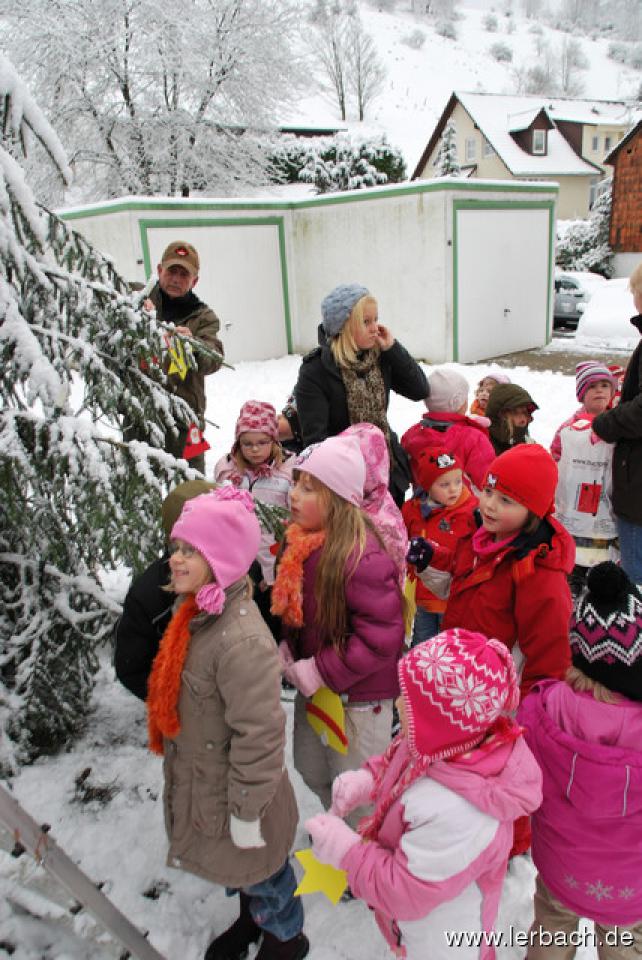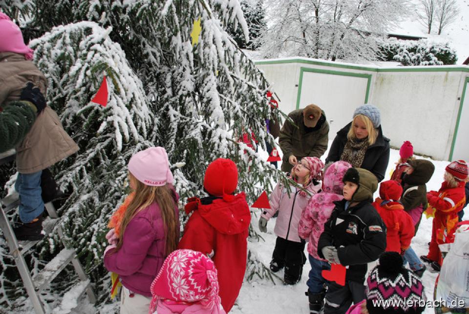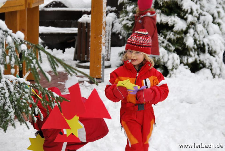 Dazu hatten die Kinde aus dem Kindergarten und dem Kindergottesdienst Sterne, Stiefel und Kerzen gebastelt, die sie heute vormittag am Weihnachtsbaum angebracht haben.