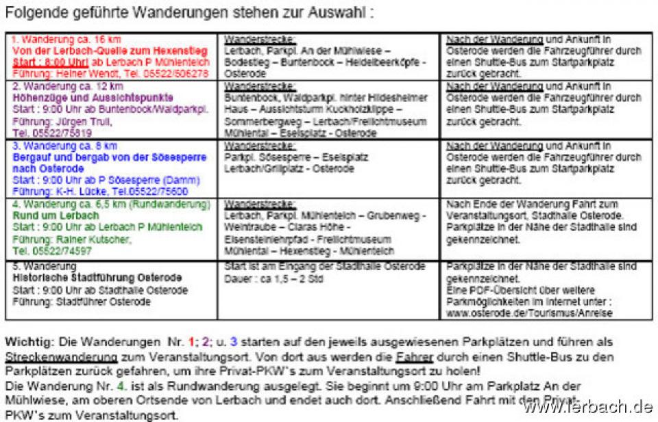 Veranstalter Harzklub-Zweigverein LerbachDer Harzklub Lerbach bereitet sich auf die Sternwanderung in diesem Jahr vor. Am 28.August 2011 werden Harzklub–Zweigvereine aus dem ganzen Land zur Stadthalle in Osterode wandern, einige von ihrem Wohnort aus. Die meisten treffen sich an verschieden Ausgangspunkten bei Lerbach und Umgebung und wandern von dort aus mit einem Wanderführer vom Harzklub Lerbach zur Stadthalle oder in Form einer Rundwanderung um Lerbach. Angeboten werden 5 Wanderungen mit einer Länge von 6,5 km bis 16 km. Gerechnet wird mit 700 – 1000 Teilnehmern, da in diesem Jahr der Harzklub-Hauptverein sein 125. jähriges Bestehen feiert.