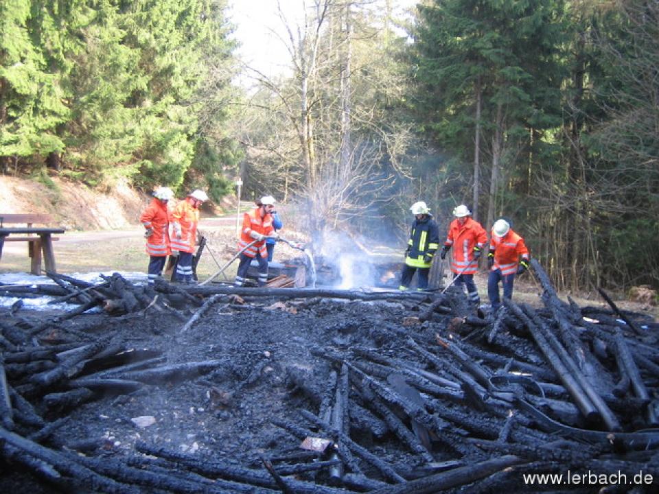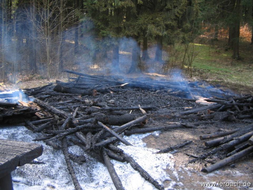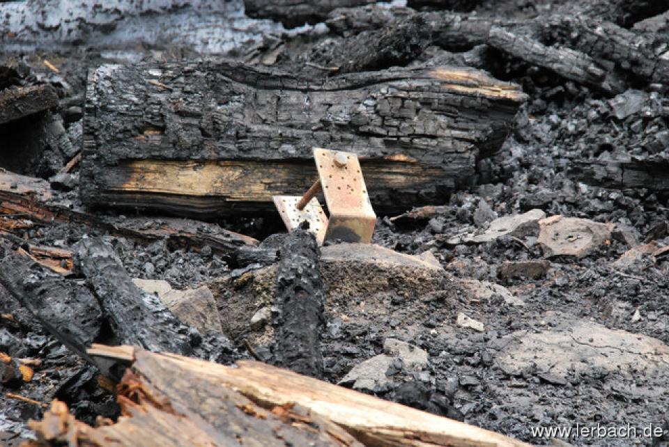 Am heutigen Sonntagmorgen war dann nur noch ein großer Aschehaufen nebst einigen verkohlten Hölzern übrig. Da dieser noch glühte rückte die Lerbacher Wehr am späten Vormittag erneut zu Nachlöscharbeiten aus.