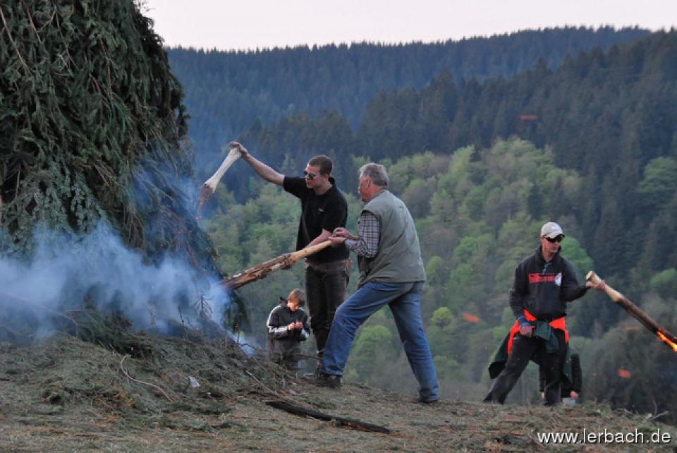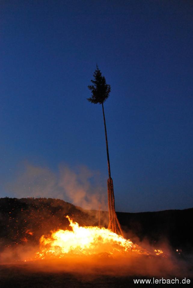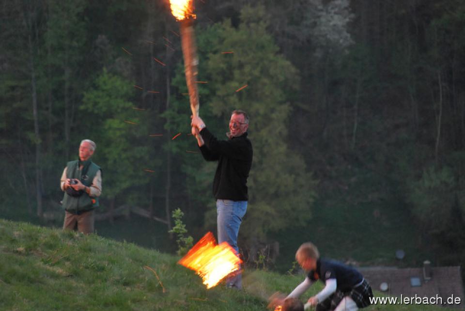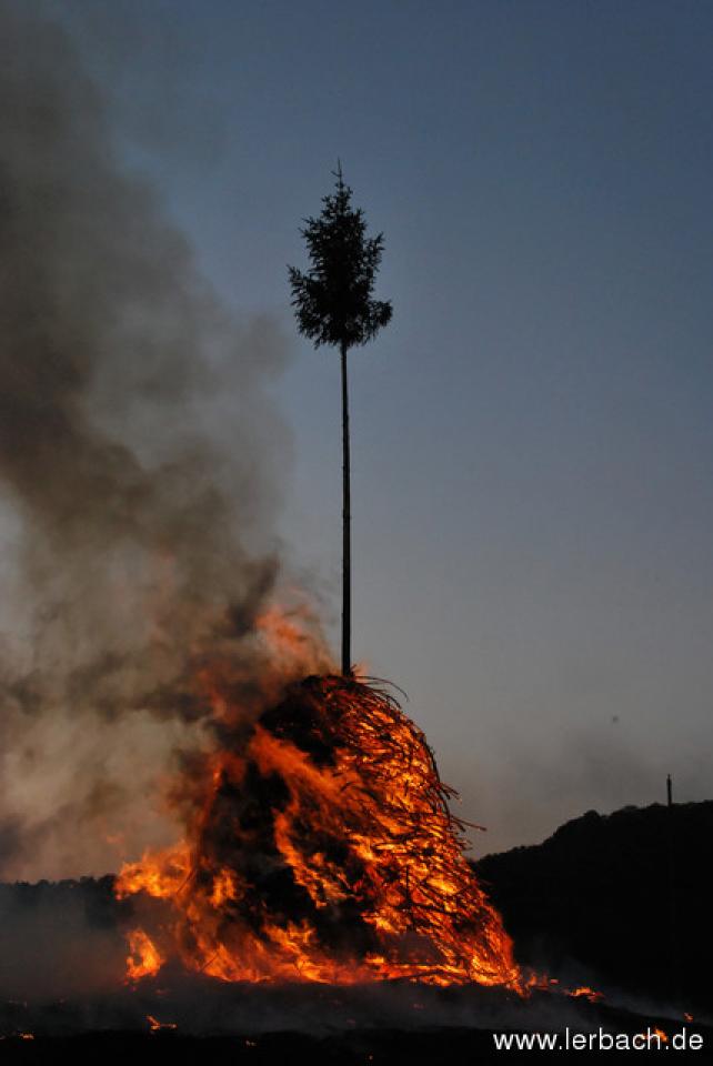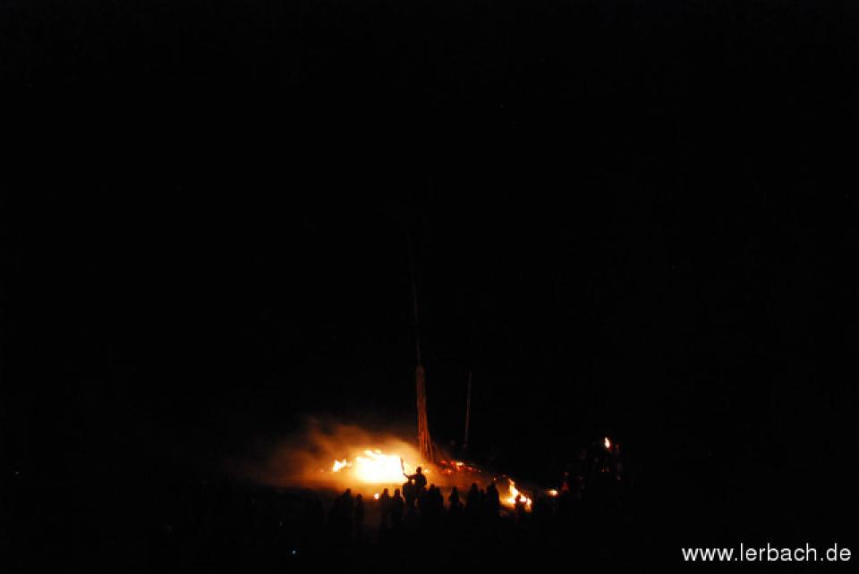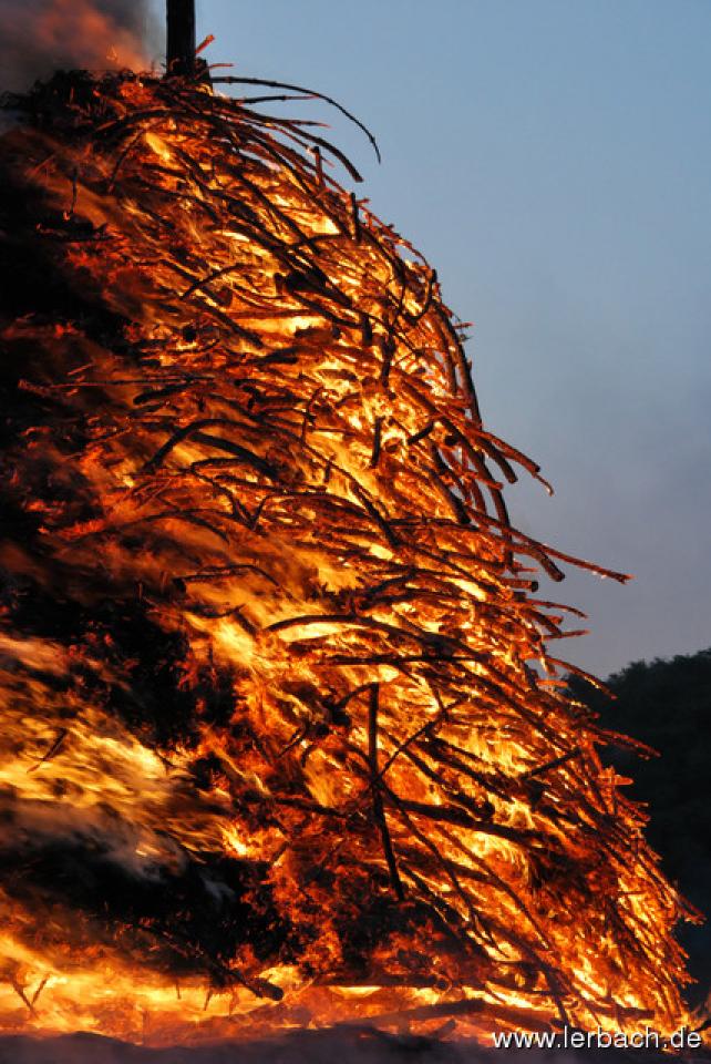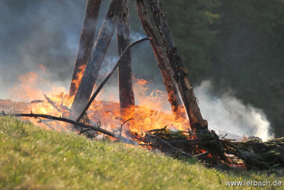 Die anhaltende Trockenheit ließ die Brandwachen der Lerbacher Feuerwehr schon beim Kinderfeuer sorgenvoll dreinblicken. Der Meiler brannte wie der sprichwörtliche Zunder und so waren die aufgeschichteten Fichtenzweige auch in Rekordzeit heruntergebrannt. Dem großen Feuer erging es nicht besser und so war schon gegen 21 Uhr nur noch ein relativ kleines Restfeuer übrig.