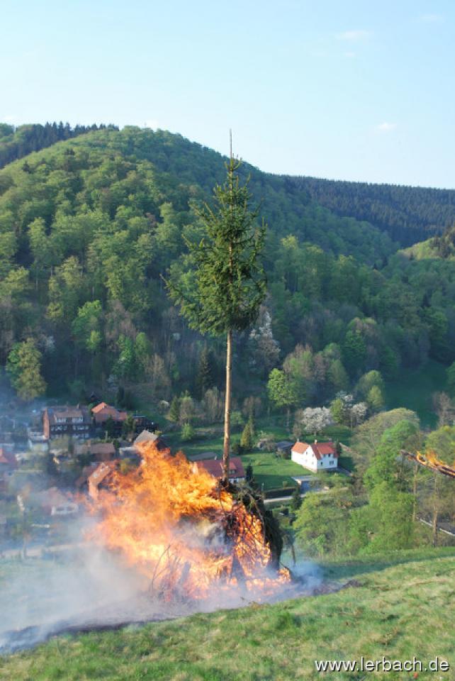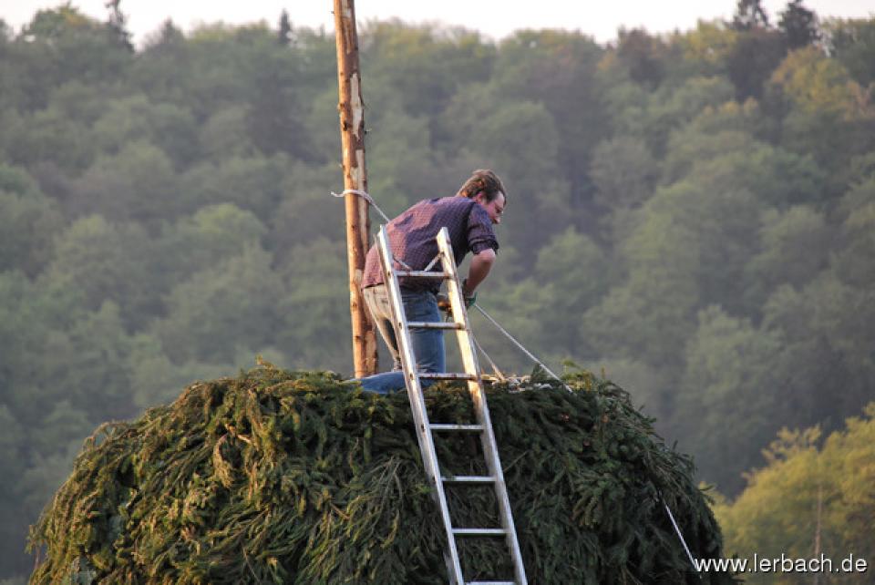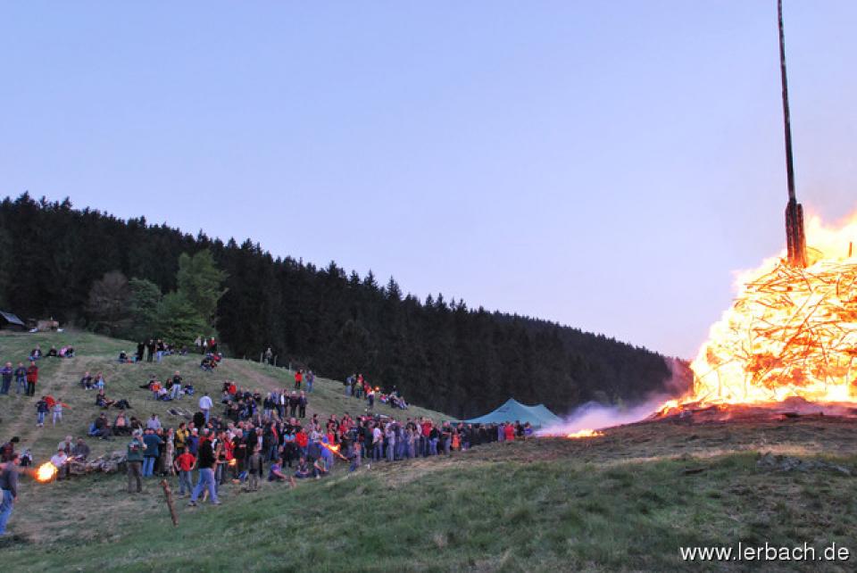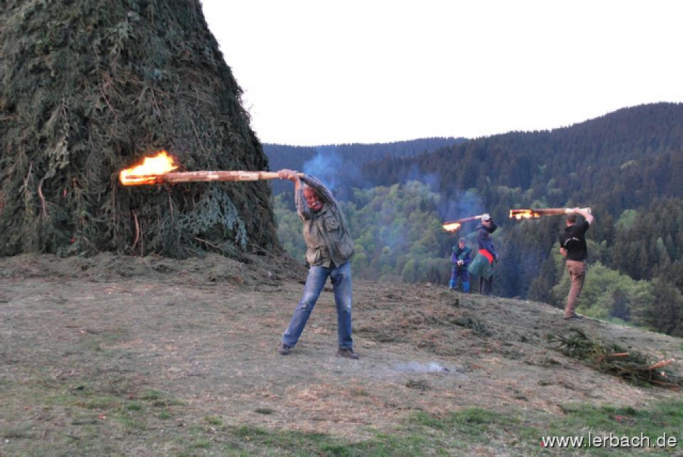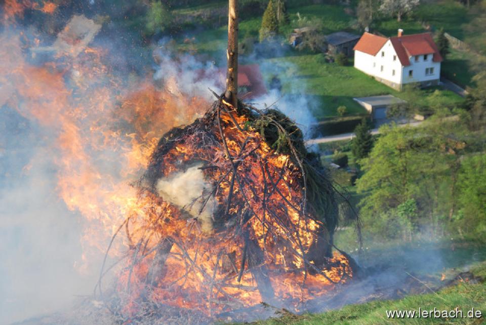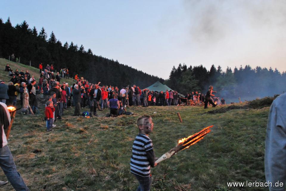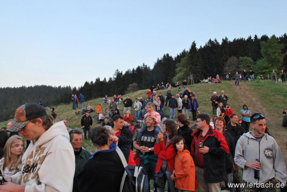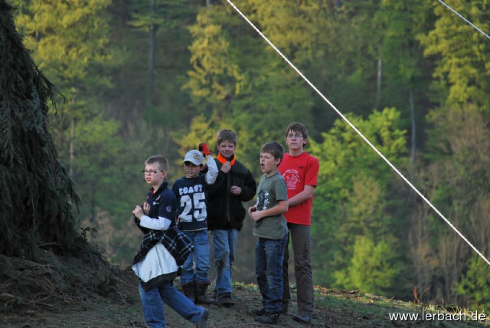 Die anhaltende Trockenheit ließ die Brandwachen der Lerbacher Feuerwehr schon beim Kinderfeuer sorgenvoll dreinblicken. Der Meiler brannte wie der sprichwörtliche Zunder und so waren die aufgeschichteten Fichtenzweige auch in Rekordzeit heruntergebrannt. Dem großen Feuer erging es nicht besser und so war schon gegen 21 Uhr nur noch ein relativ kleines Restfeuer übrig.