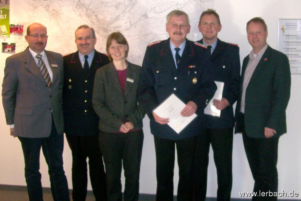 v.l.n.r. Frank Regelin, Stadtbrandmeister Thomas Schulze, Fachbereichsleiterin Dr. Viola Sporleder-Geb, Wilfried Kratsch, Andreas Kratsch und Osterodes Bürgermeister Klaus Becker