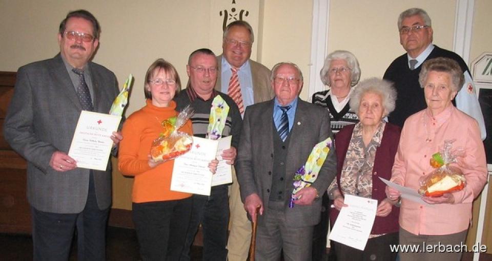 Die Geehrten des DRK Ortsvereins Lerbach mit Dr. med. Leopold von Gerstenbergk-Helldorff, der Vorsitzenden Hanna Müller und Gruppenleiter Rainer Neske (hintere Reihe von links).