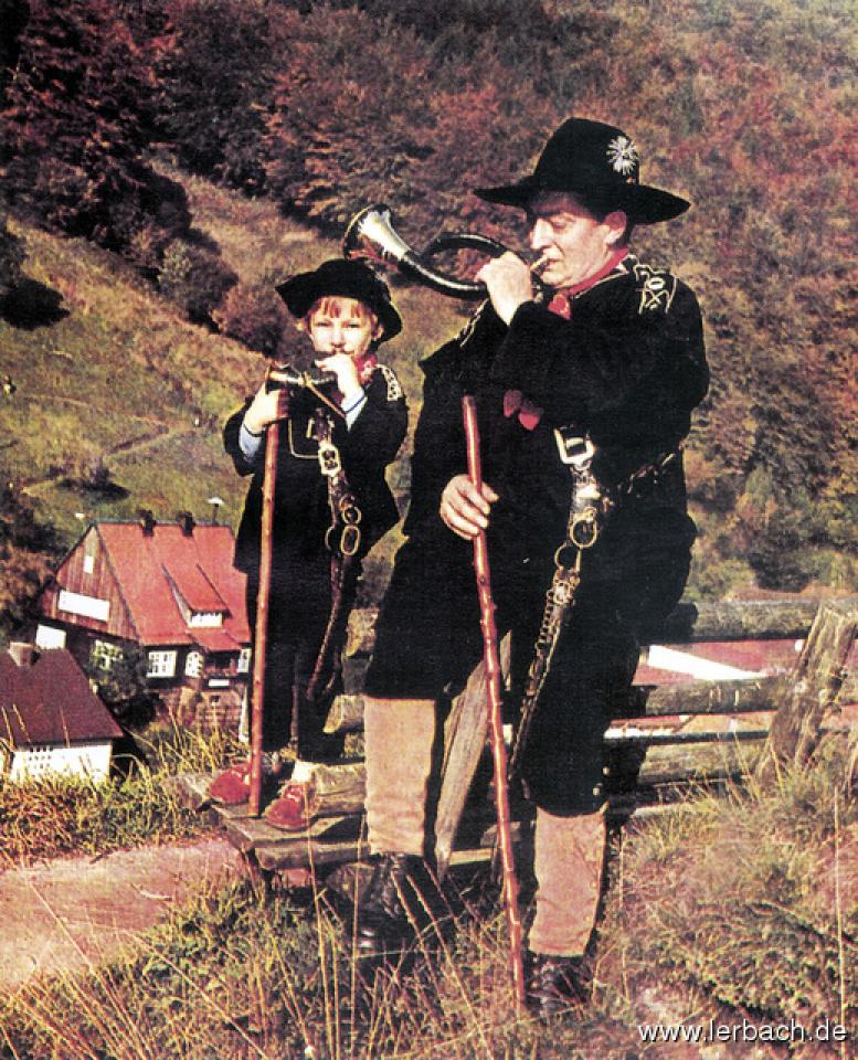 Der letzte Lerbacher Kuhhirte Bruno Arend mit seiner Tochter Martina im Jahre 1968 auf dem Schwarzenberg