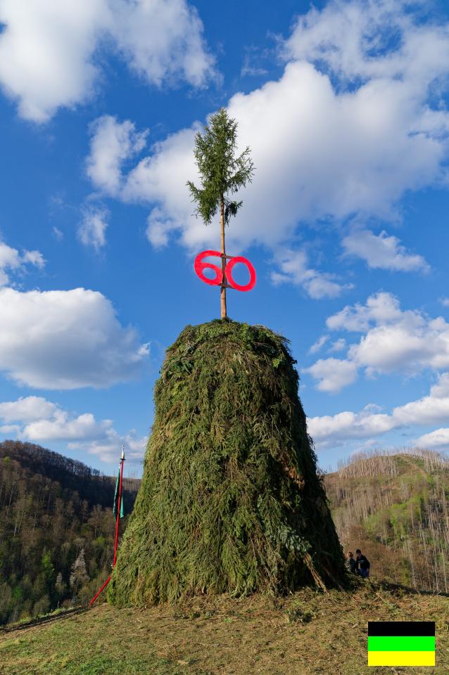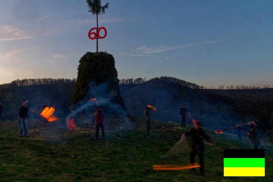Das 60-jährige "Osterfeuer der Neuzeit" am Hexenzipfel stand unter einem guten Stern: nachdem es am Vortag für die Helfer schneidend kalt und windig war, zogen die Wolken am Samstagnachmittag weg und unter blauem Himmel füllte sich der Platz, um die 60. Auflage des Osterbrauchs zu begehen.
