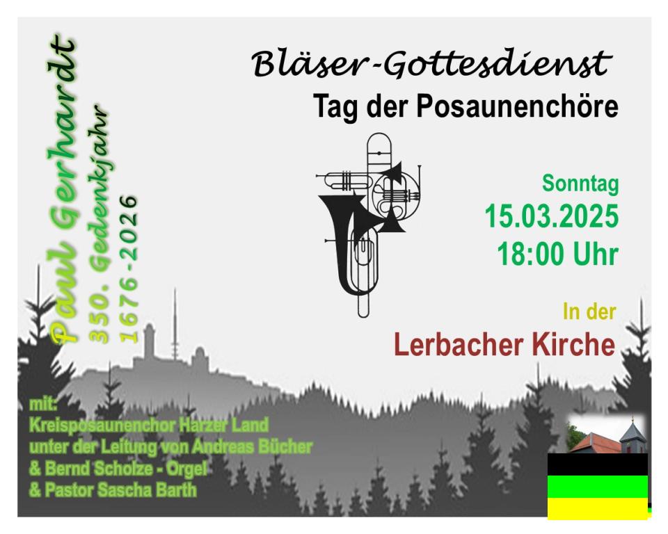 Am Sonntag, den 15.03.2026 lädt der Kreisposaunenchor Harzer Land unter der Leitung von Andreas Buecher zusammen mit Organist Bernd Scholze sowie Pastor Sascha Barth ab 18:00Uhr zu einem besonderen Gottesdienst unter dem Motto "Paul Gerhardt" in die Lerbacher Kirche ein.
