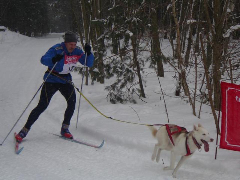 Was passiert dann aber? Müller-Simons gehören zu einer kleinen eingeschworenen Szene von Schlittenhunde-Begeisterten, die oft im Harz, manchmal auch weiter weg ihre Rennen austragen. Dies geschieht nicht nur mit einer ganzen Meute Hunde vorm Schlitten, sondern in der sog. Skandinavierklasse auch mit einem Hund, der den Skiläufer (oder Jogger, wenn kein Schnee liegt) zusätzlich zieht.