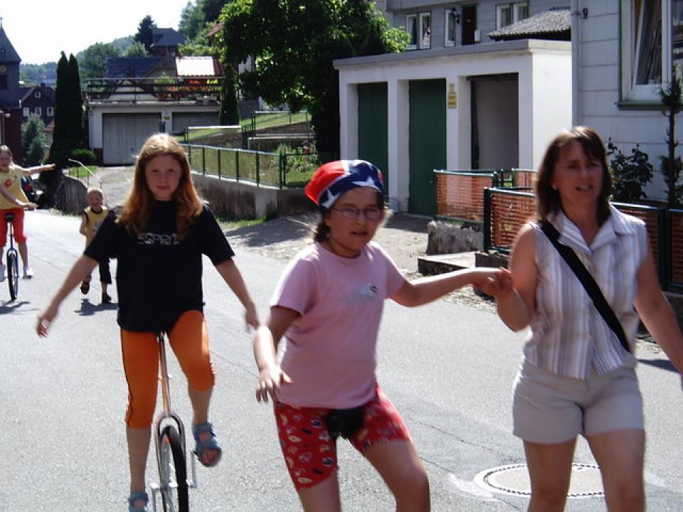 Diesmal ging es nicht um Technik und Geschicklichkeit wie bei den "normalen" Übungsstunden in der Halle sondern um ein Erlebnis in der Gruppe. So sah man am Montag nachmittag eine lange Schlange von Kindern mit dem Einrad durchs Dorf fahren.