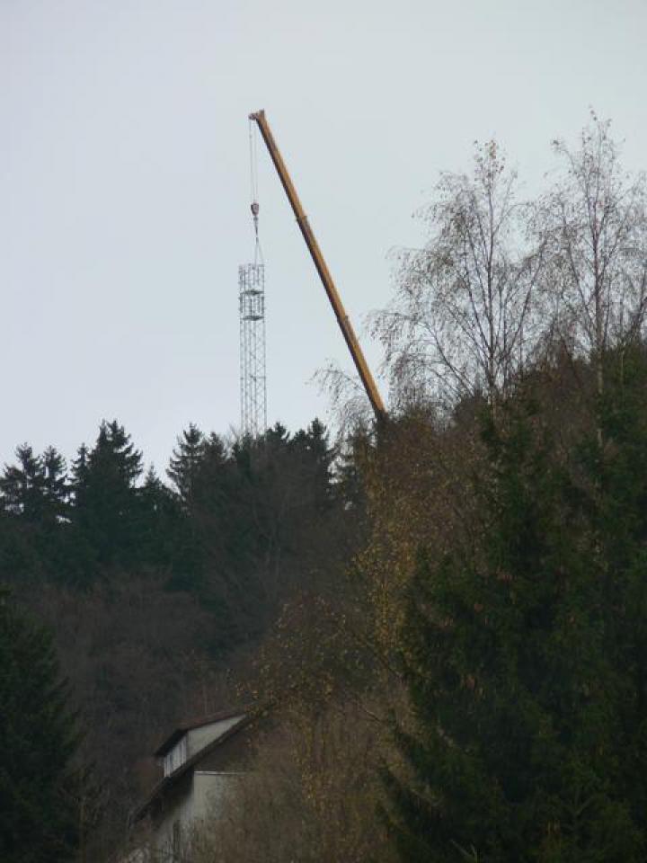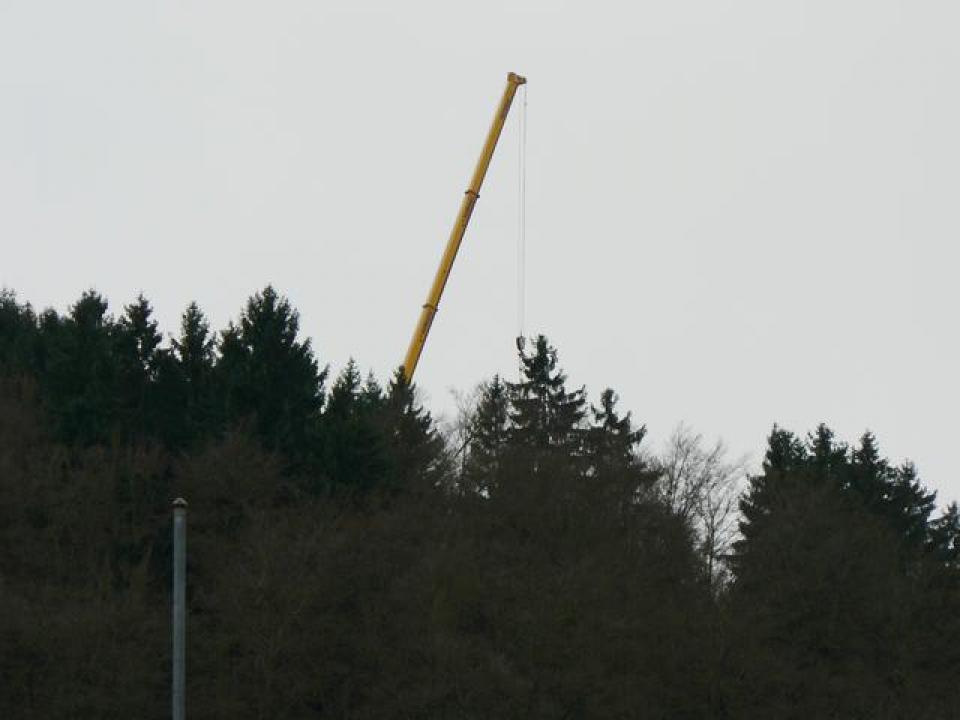 Schwerlastkran setzt einzelne Turmstücke aufeinanderWenn ein Schwerlastkran durch Lerbach fährt, dann tut er dies nicht unbemerkt. So auch heute nicht. Dieser Kran mußte etwas mit dem Mobilfunkturm zu tun haben! So ist es denn auch: Der Kran steht oben auf der Roten Sohle und hebt die einzelnen Turmstücke auf einander.